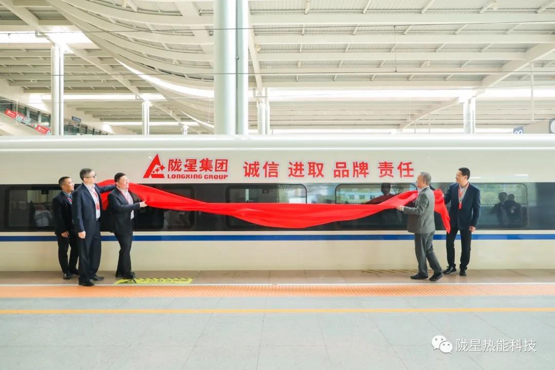 在首發儀式工作人員的引導下,出席隴星集團高鐵冠名首發儀式的領導及嘉賓來到了隴星集團高鐵冠名列車所在的站臺。主持人邀請隴星集團副總、隴星熱能科技公司總經理趙明珠先生與華鐵傳媒集團副總裁杜勁松先生,以及隴星熱能科技公司三位員工代表共同為隴星集團的高鐵冠名列車揭幕,現場響起了熱烈的掌聲,站臺上來來往往的乘客也駐足觀看,高鐵列車上紅色的隴星集團LOGO及隴星企業精神八個大字格外引人注目。